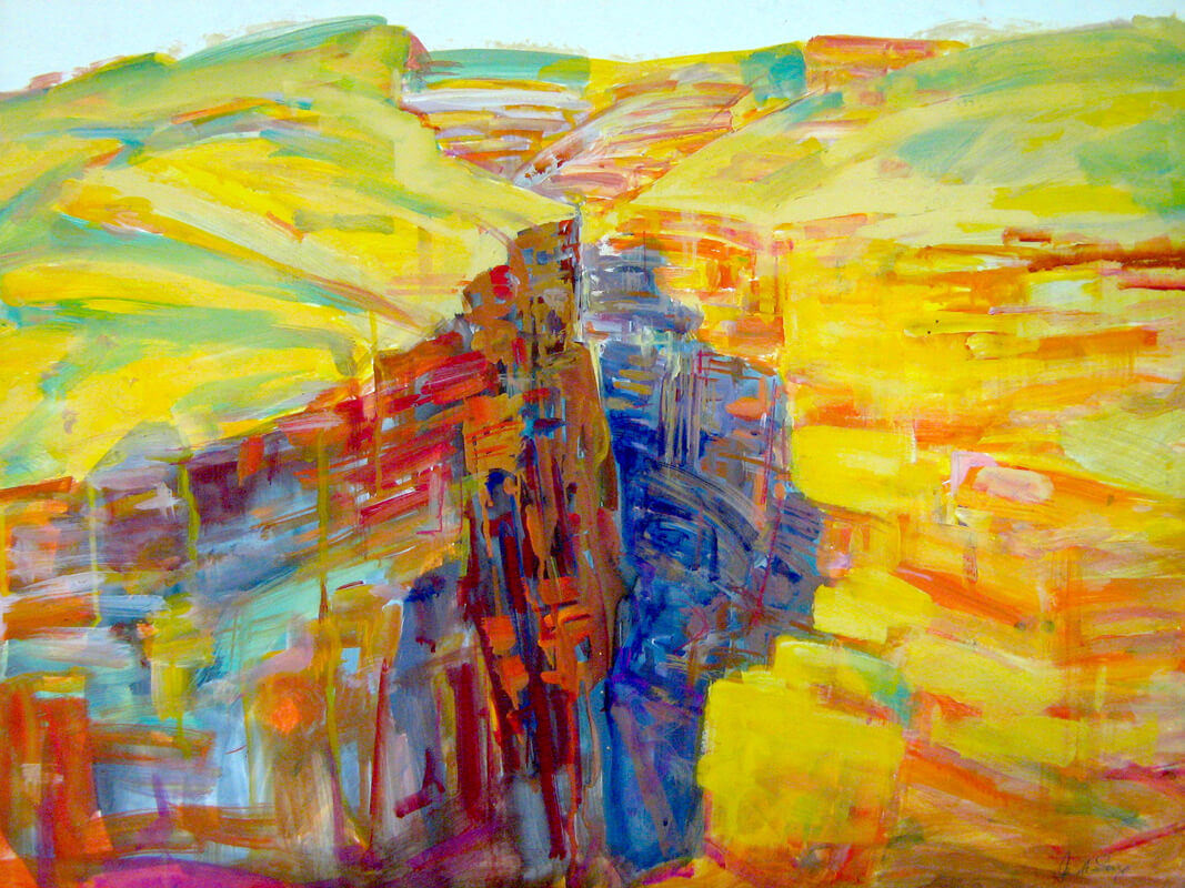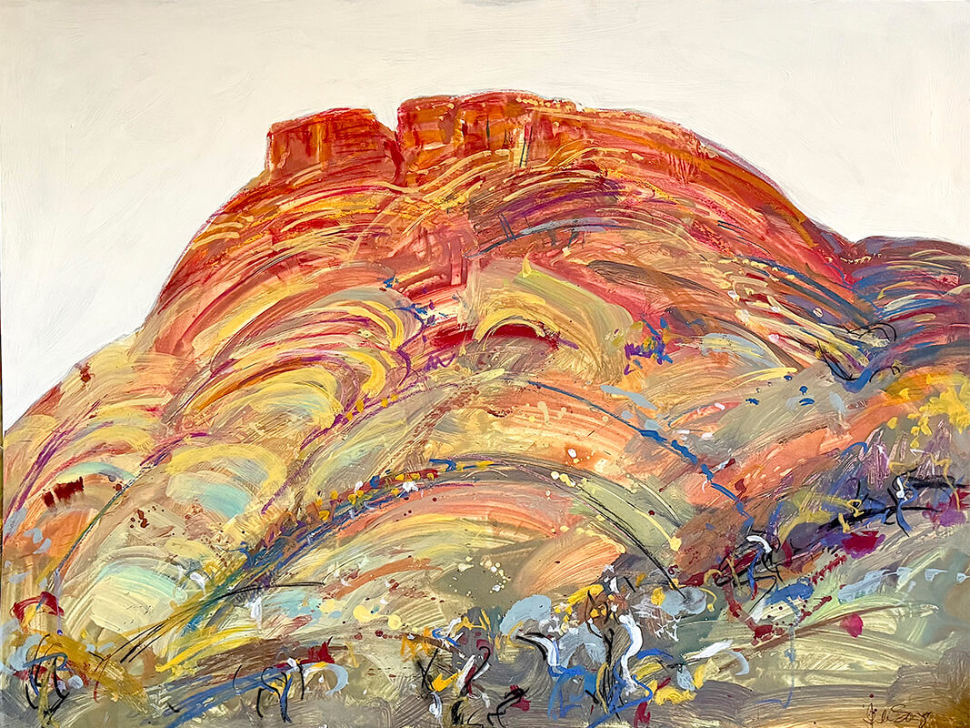In contrast, the works developed in Karijini National Park respond to the powerful geological character of the Pilbara. Iron-rich earth, deep gorges and expansive skies create a terrain of striking chromatic intensity and shifting light.
