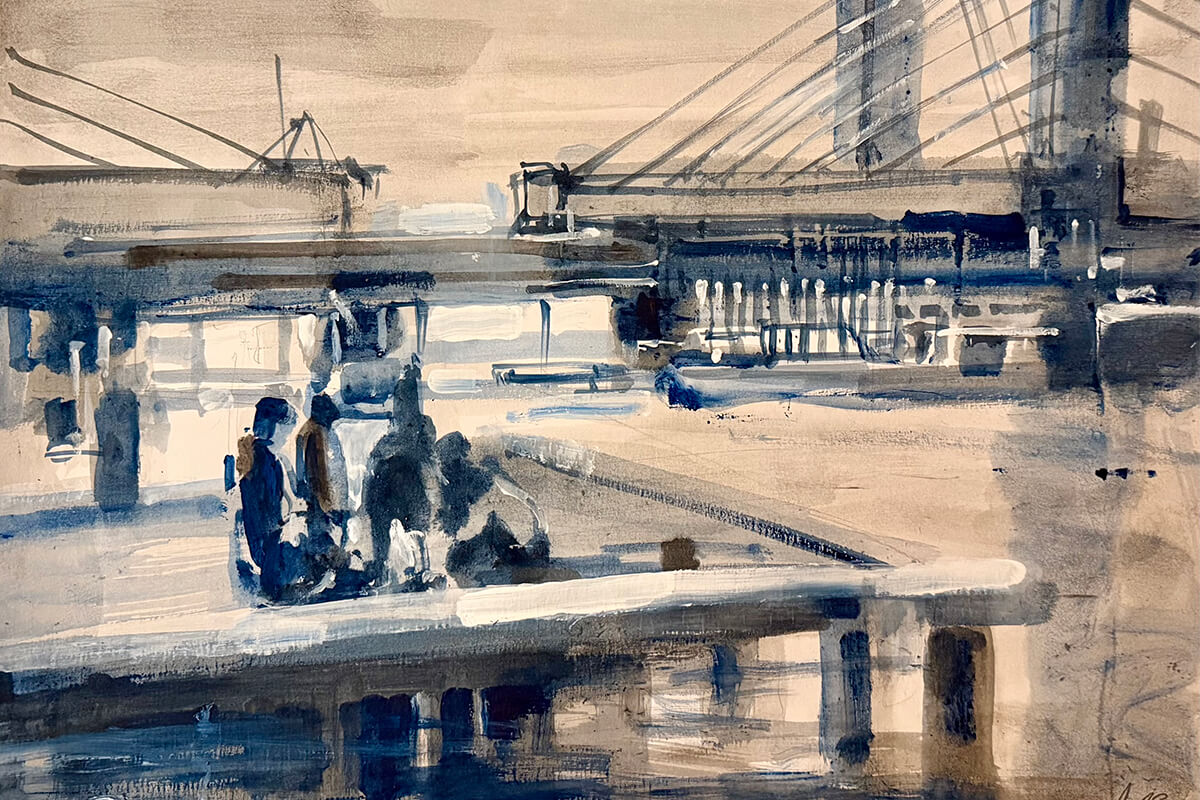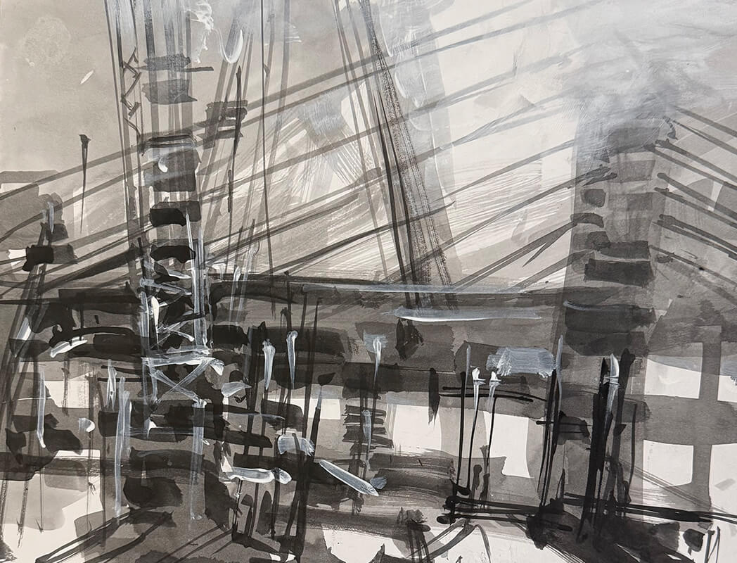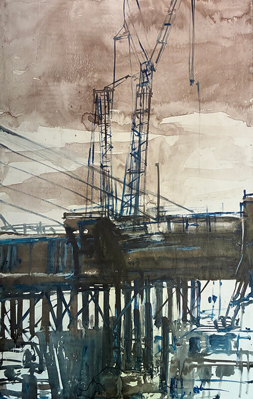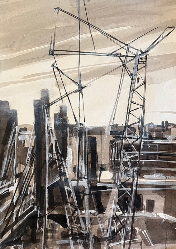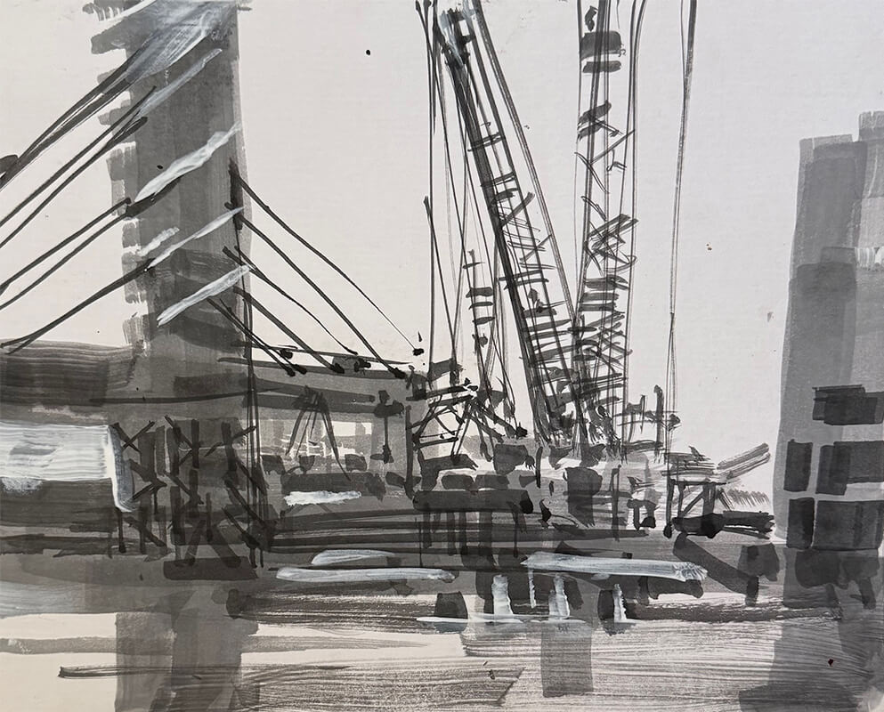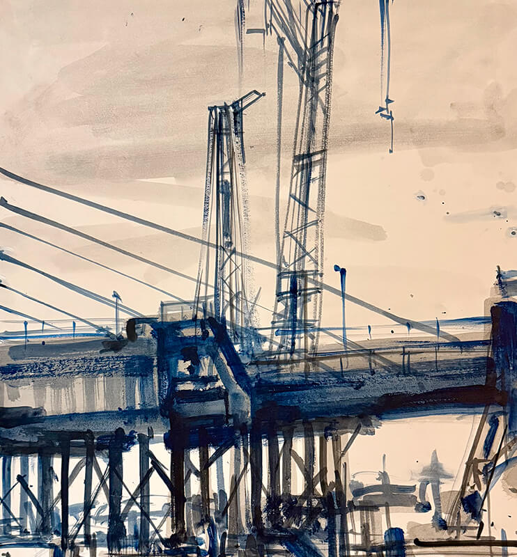 The port city has long anchored the artist's life and practice. This series of monochrome drawings and paintings explores the geometry and rhythm of the built environment. The Fremantle Bridge appears as a recurring motif - an image the artist has revisited throughout his career.