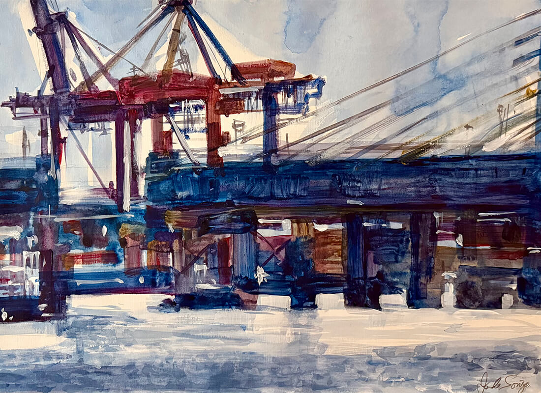 Port to Pilbara brings together two environments that have shaped his artistic vision: the maritime architecture of Fremantle and the ancient geological formations of the Pilbara, both executed en plein air.