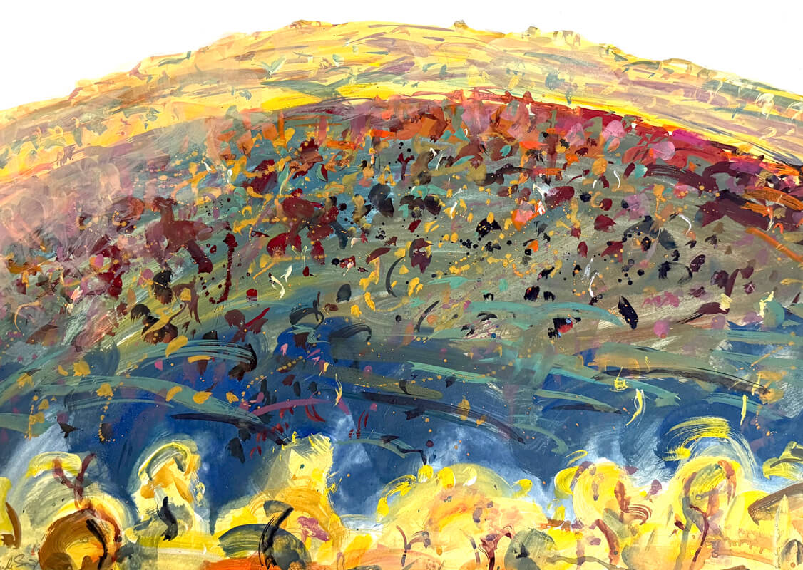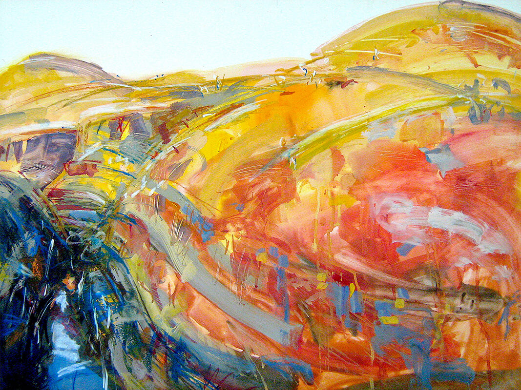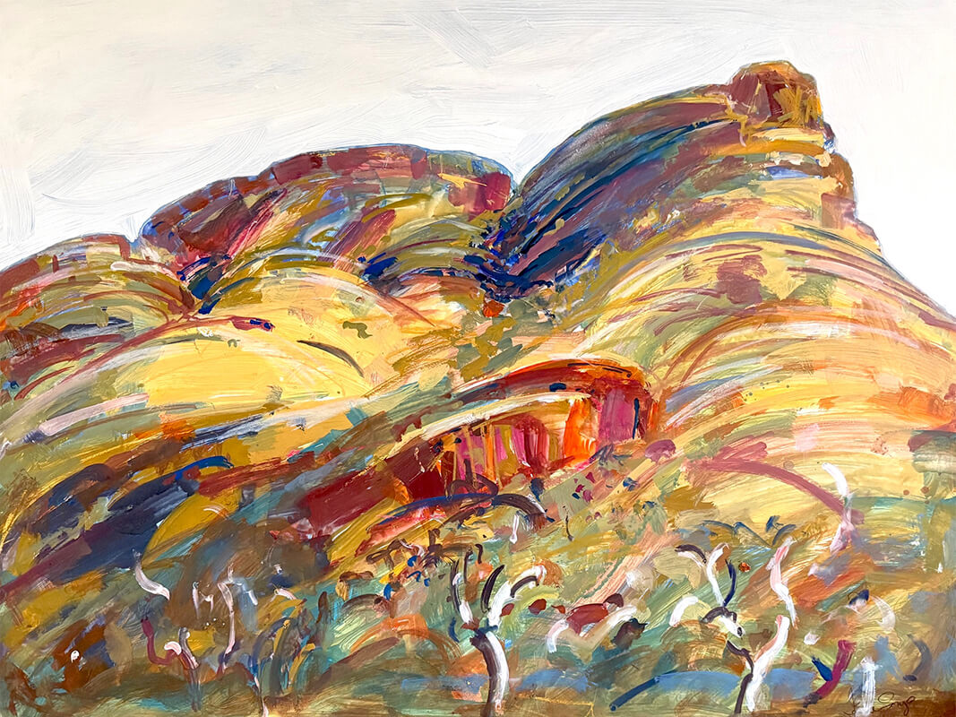 In contrast, the works developed in Karijini National Park respond to the powerful geological character of the Pilbara. Iron-rich earth, deep gorges and expansive skies create a terrain of striking chromatic intensity and shifting light.